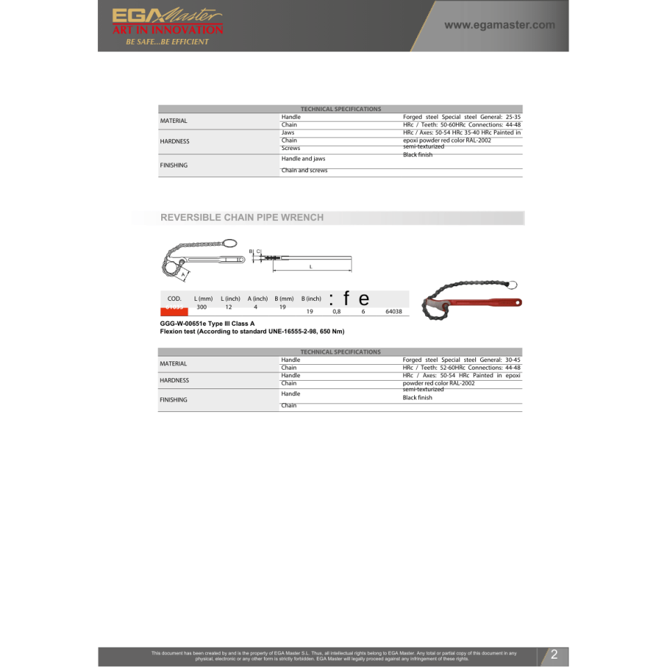 - EGAMASTER Ağır Tip Zincirli Boru Anahtarları, damgalı çelik sap ve çeneye sahiptir.